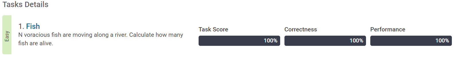 We assume that all the fish are flowing at the same speed. That is, fish moving in the same direction never meet. The goal is to calculate the number of fish that will stay alive.