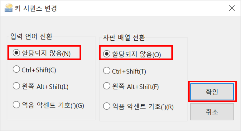 7. 자판 배열 전환에서 '할당되지 않음(N)' 선택