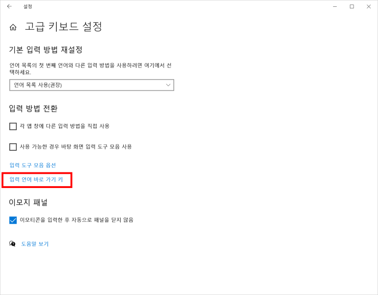 3. 고급 키보드 설정에서 '입력 언어 바로 가기 키' 클릭