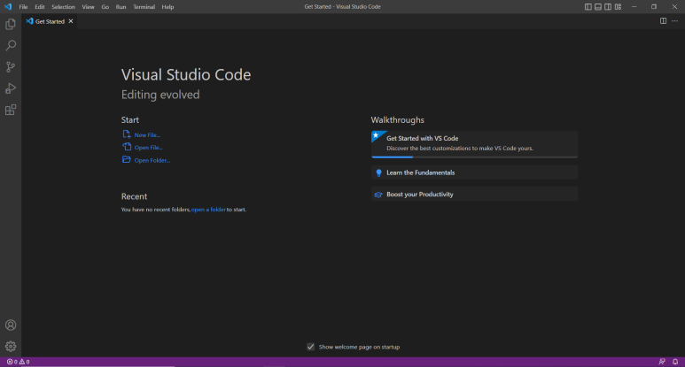 21. 정상적으로 설치가 완료되었을 경우 다음과 같은 Visual Studio Code 화면이 나타남
