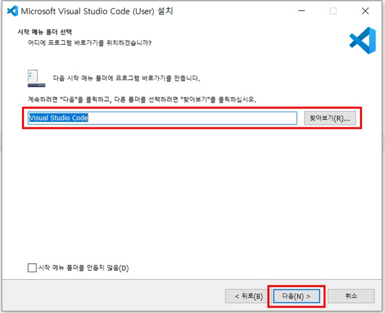- 다른 위치에 Visual Studio Code를 설치하고 싶으면 찾아보기... 버튼을 클릭하여 설치할 폴더 위치 선택 가능