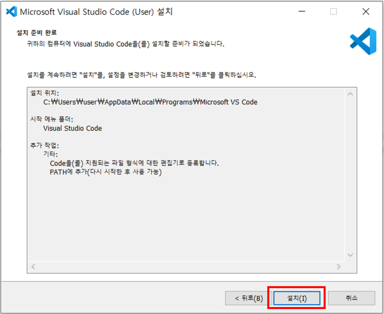 - 'PATH에 추가'는 Windows 환경설정에 Visual Studio Code 설치 경로를 자동으로 등록해주는 기능으로,