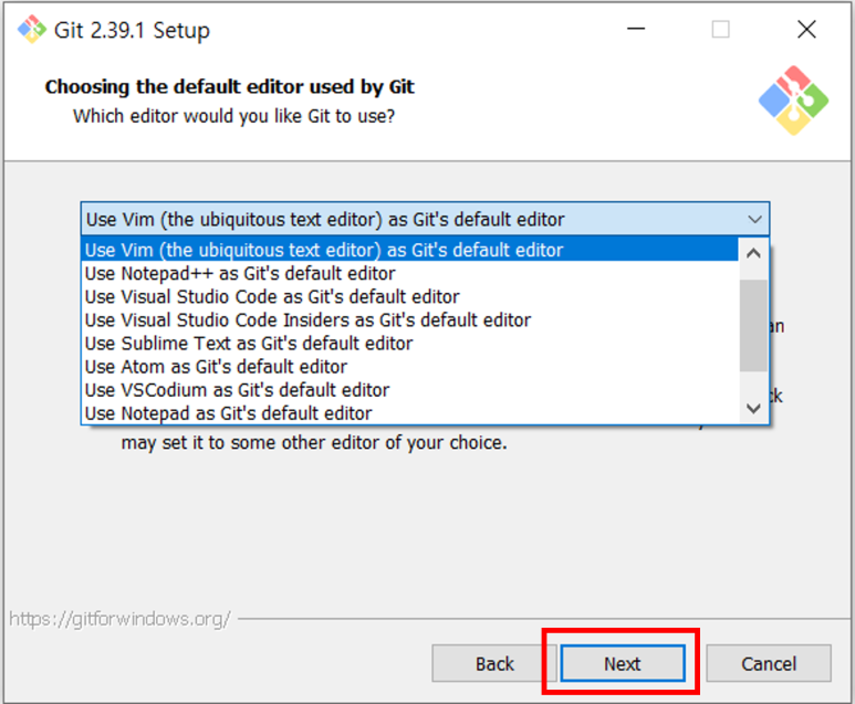14. git을 설치할 때 기본으로 사용할 에디터 선택