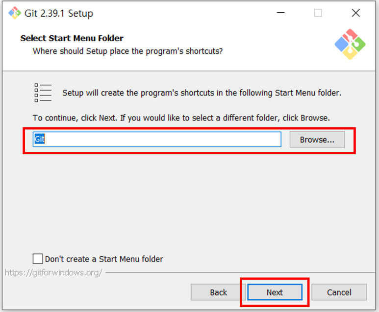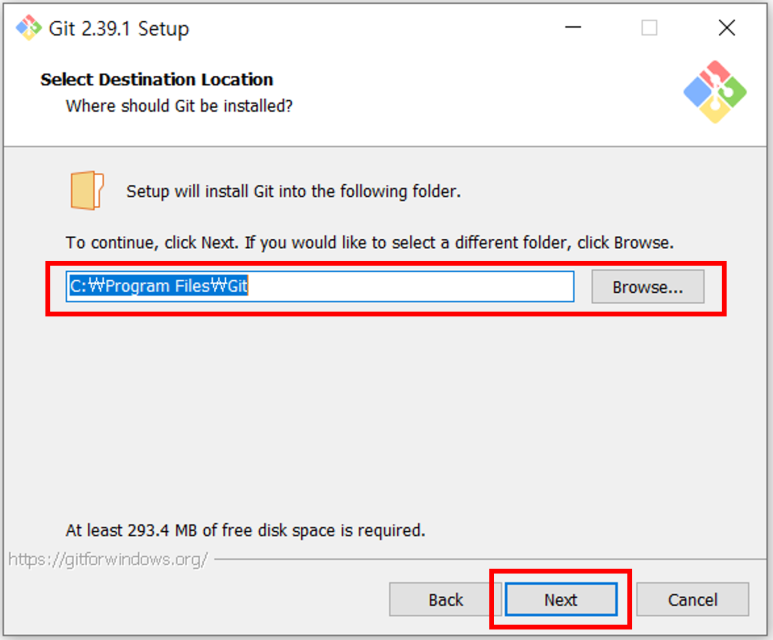 - 다른 위치에 Git을 설치하고 싶으면 Browse... 버튼을 클릭하여 설치할 포더 위치 선택 가능