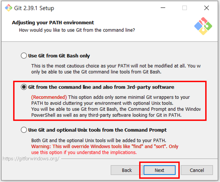 - Git 설치 시 같이 설치되는 Git Bash에서만 Git을 사용하고 싶은 경우 첫 번째 항목 선택