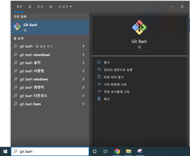 41. 시작 메뉴에서 Git Bash를 검색하였을 경우 위와 같이 출력되면 정상적으로 설치가 된 것