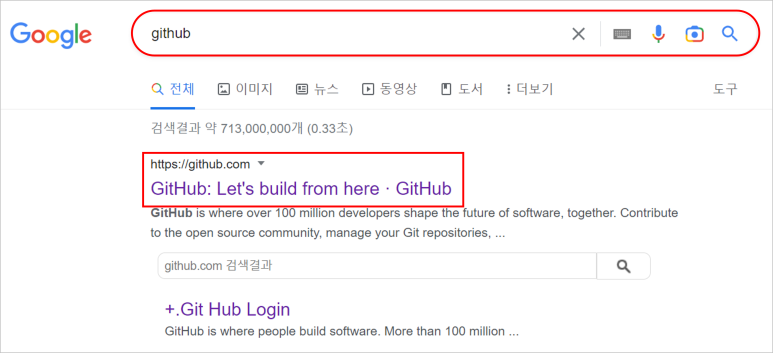 2. 검색된 정보 중 가장 상위에 있는 GitHub: Let's build from here · GitHub 선택