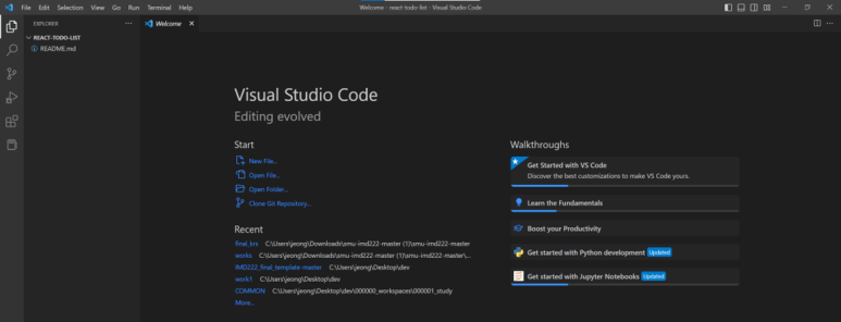 처음 Visual Studio Code를 설치했더니 메뉴가 한글로 나오네요.