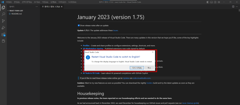 5. 언어를 변경하기 위해 Visual Studio Code를 재실행해야 한다는 메시지 출력