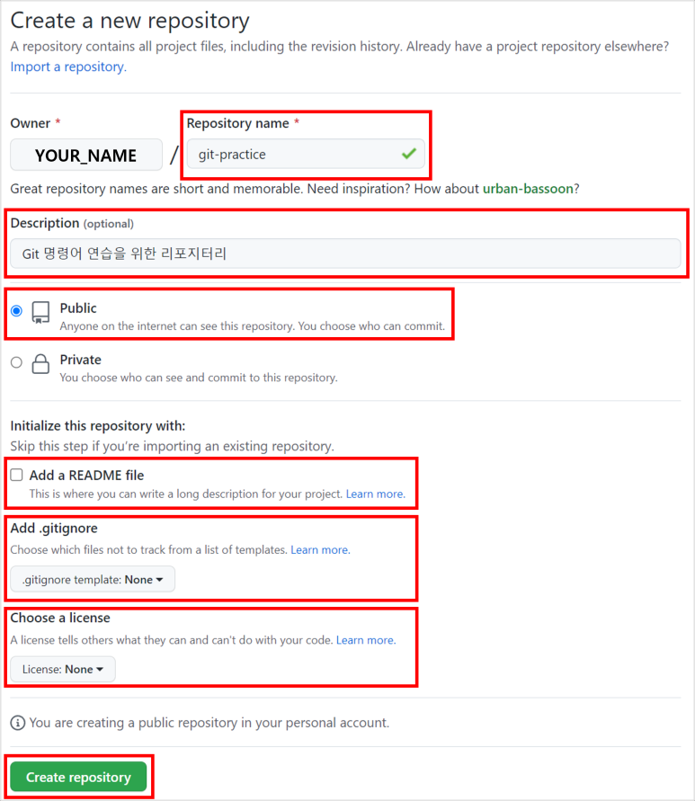 - 필자는 연습을 위한 Repository이기 때문에 Public으로 생성
