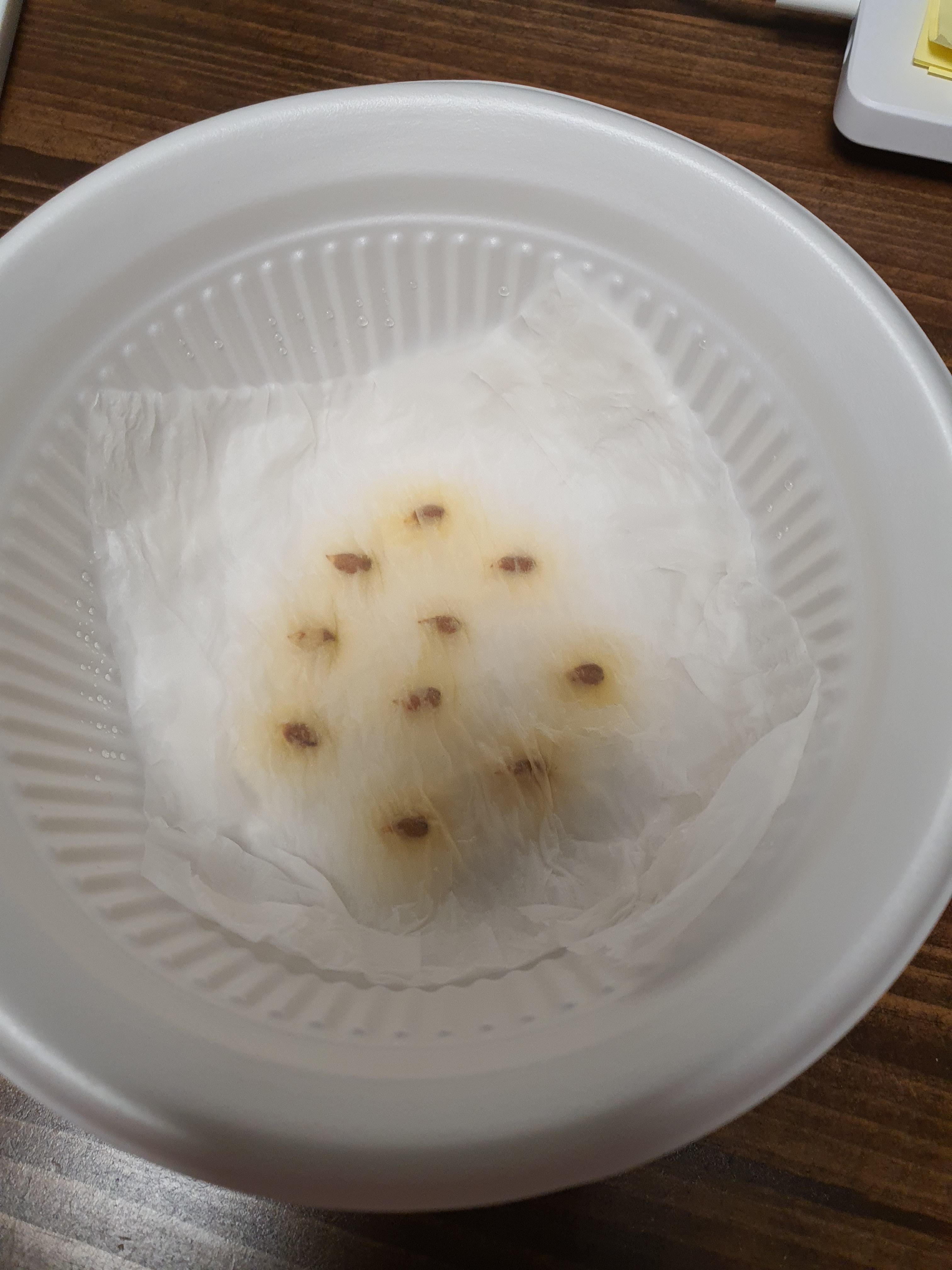 일회용 그릇에 휴지를 놓고 씨앗을 가지런히 놨어요!