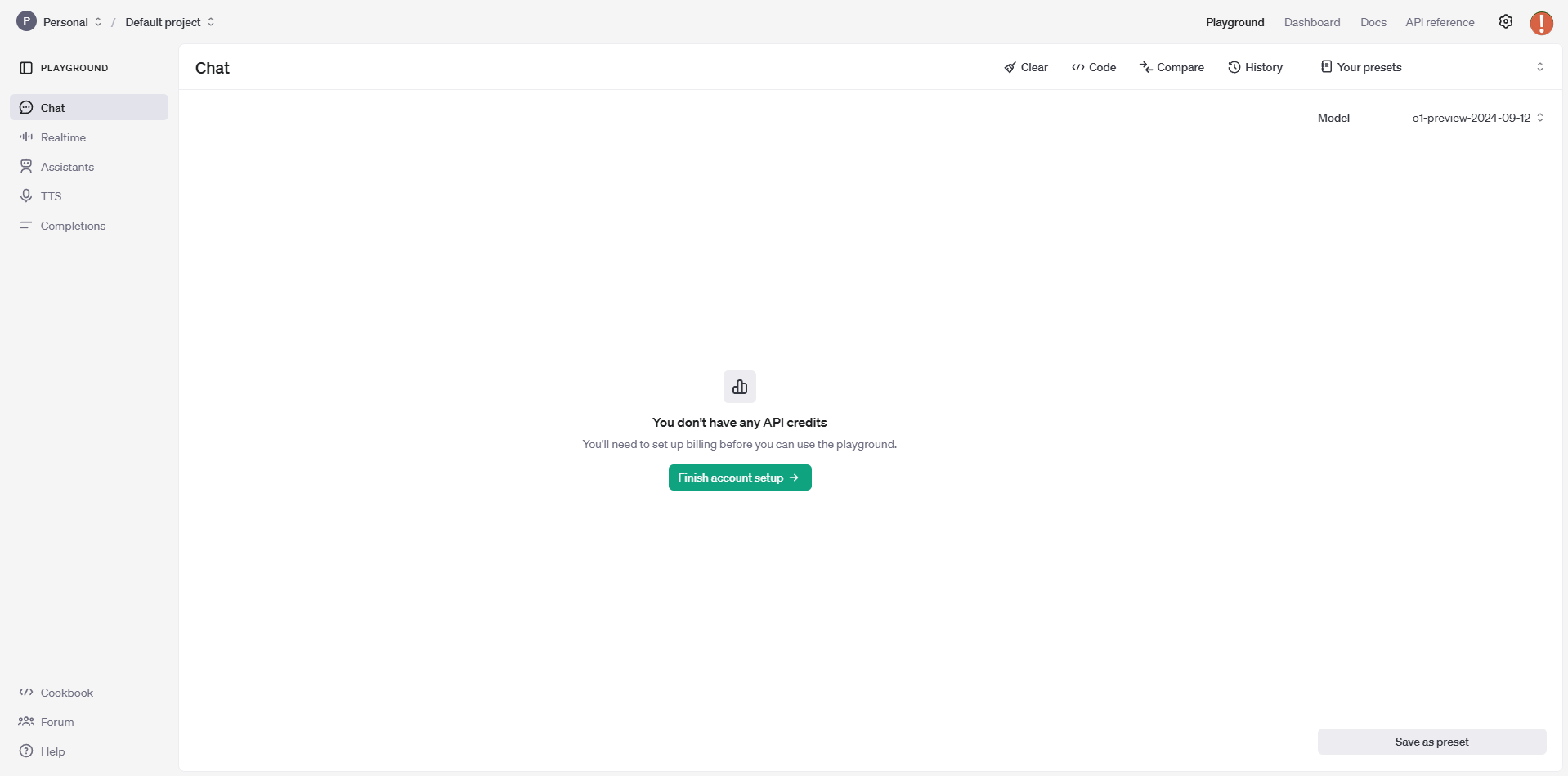 'API 크레딧(Credit)이 없으니... 플레이그라운드(Playground)를 쓰고싶으면 결제해라!'는 의미죠.
