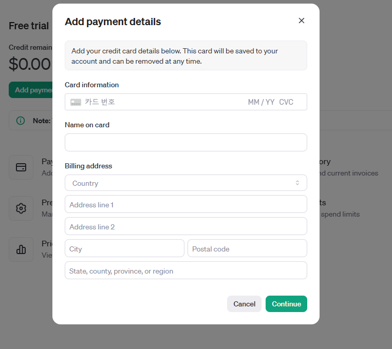 # 크레딧(Credit) 충전을 위해 카드 정보 입력하기