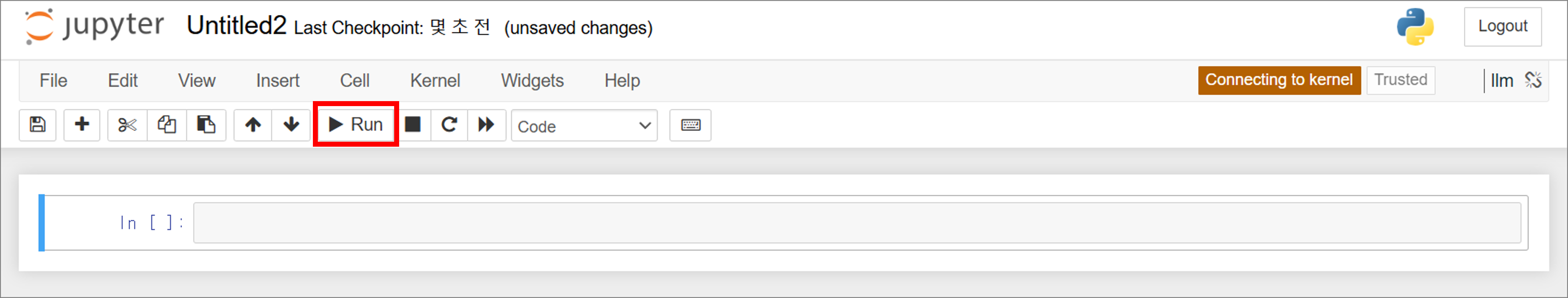 이제 "in [ ] :" 옆에 Python 코드를 입력하고 "Run" 버튼을 누르면 가상환경에서 Python 코드가 실행될거에요.