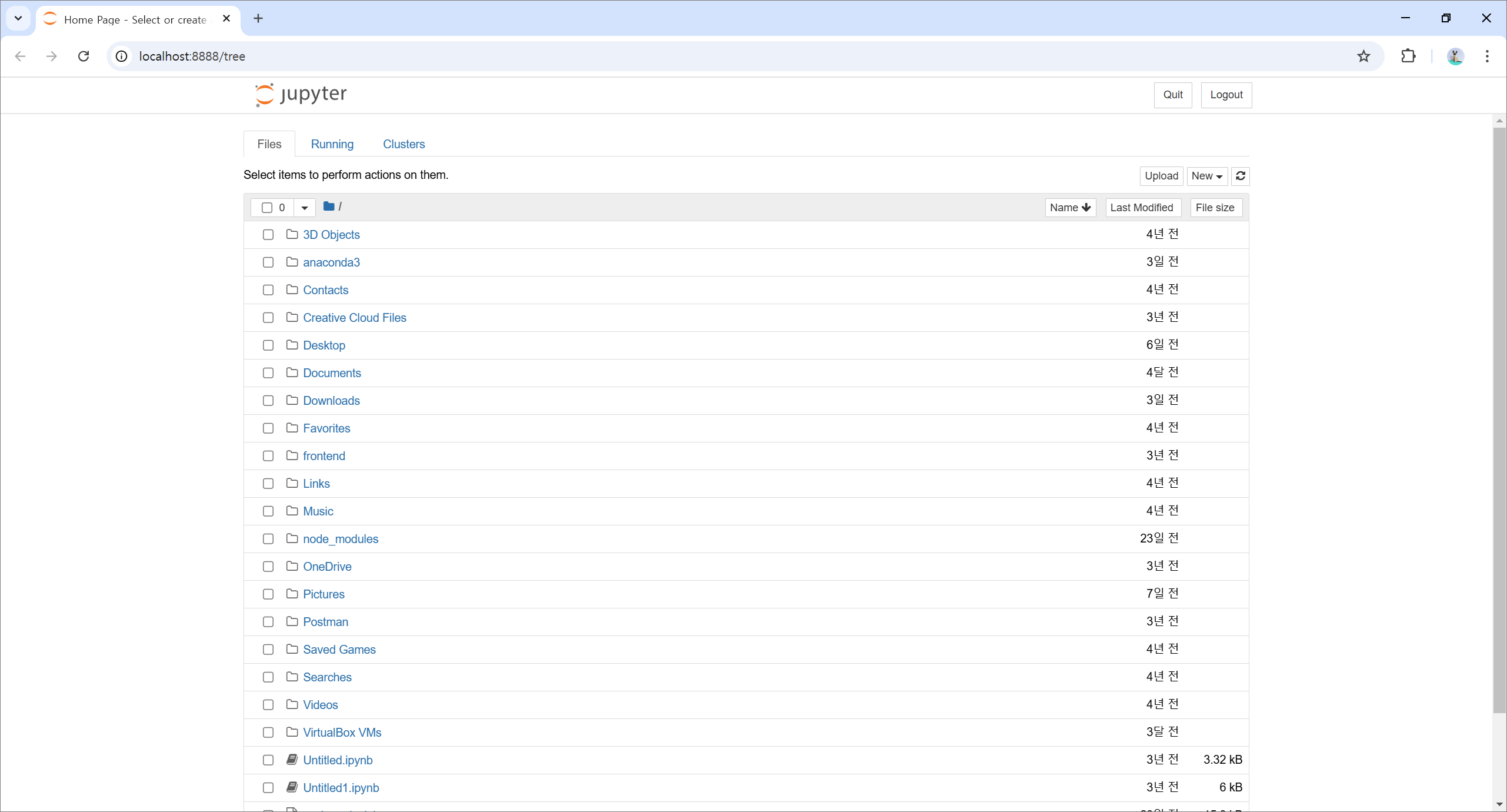 주피터 노트북이 정상적으로 실행되면 위에 이미지와 같은 화면이 브라우저에 나타날거에요.