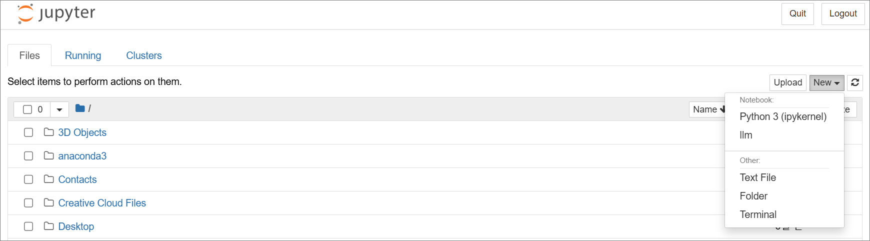 주피터 노트북 화면에서 "New" 버튼을 눌러볼까요?