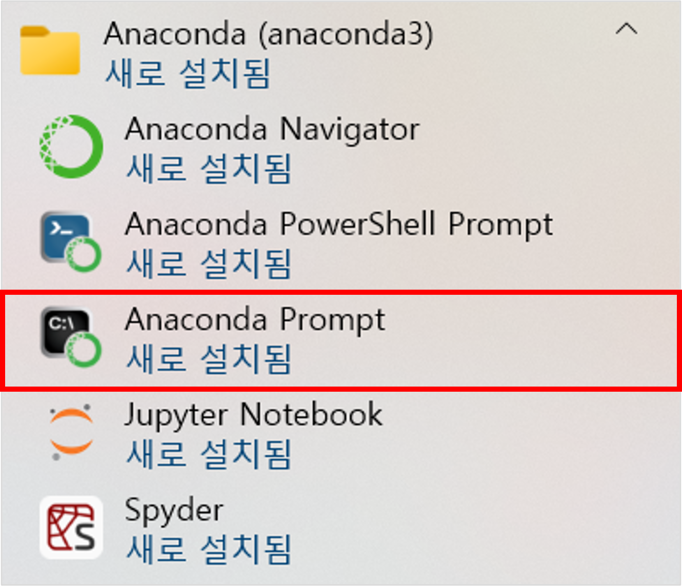 그리고 설치된 Anaconda 폴더에 있는 "Anaconda Prompt"를 실행해주세요.