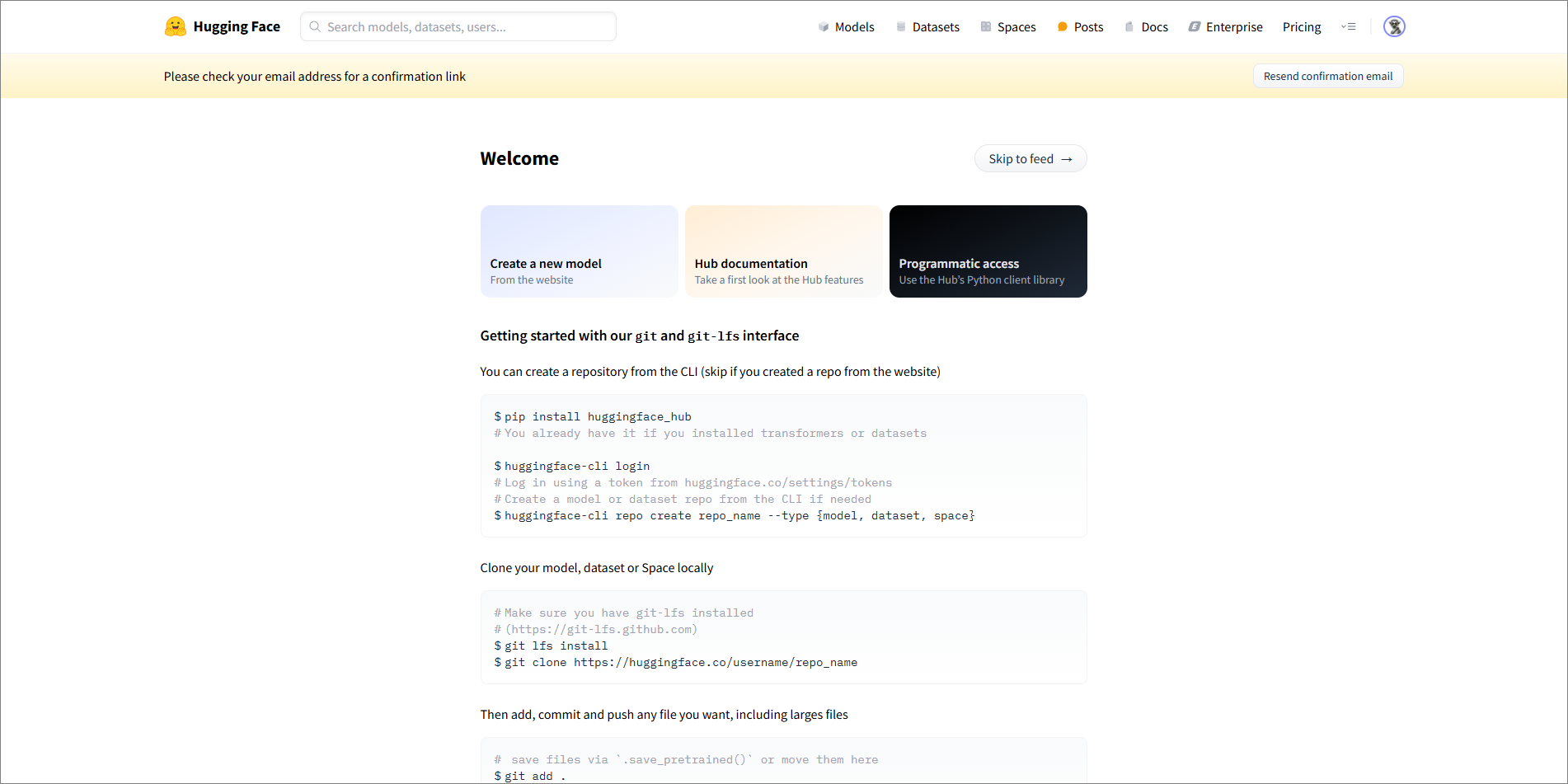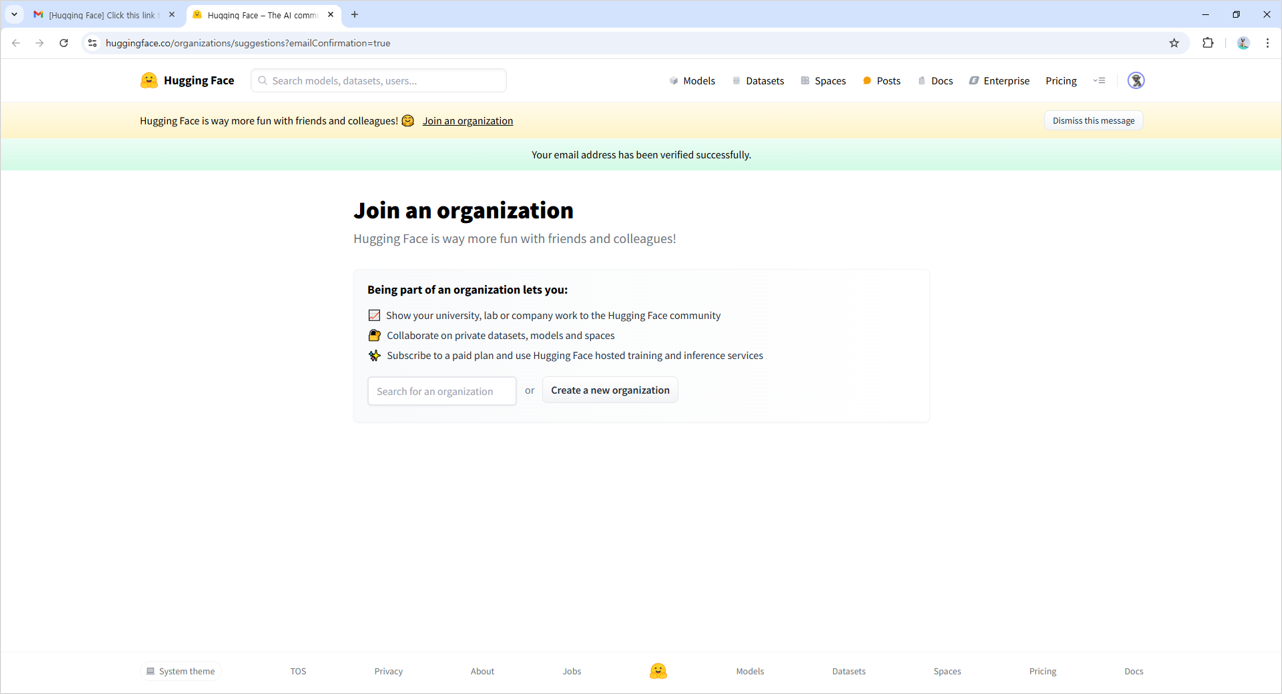 허깅페이스의 로고 바로 아래를 보면 'Please check your email address for a confirmation link'라는