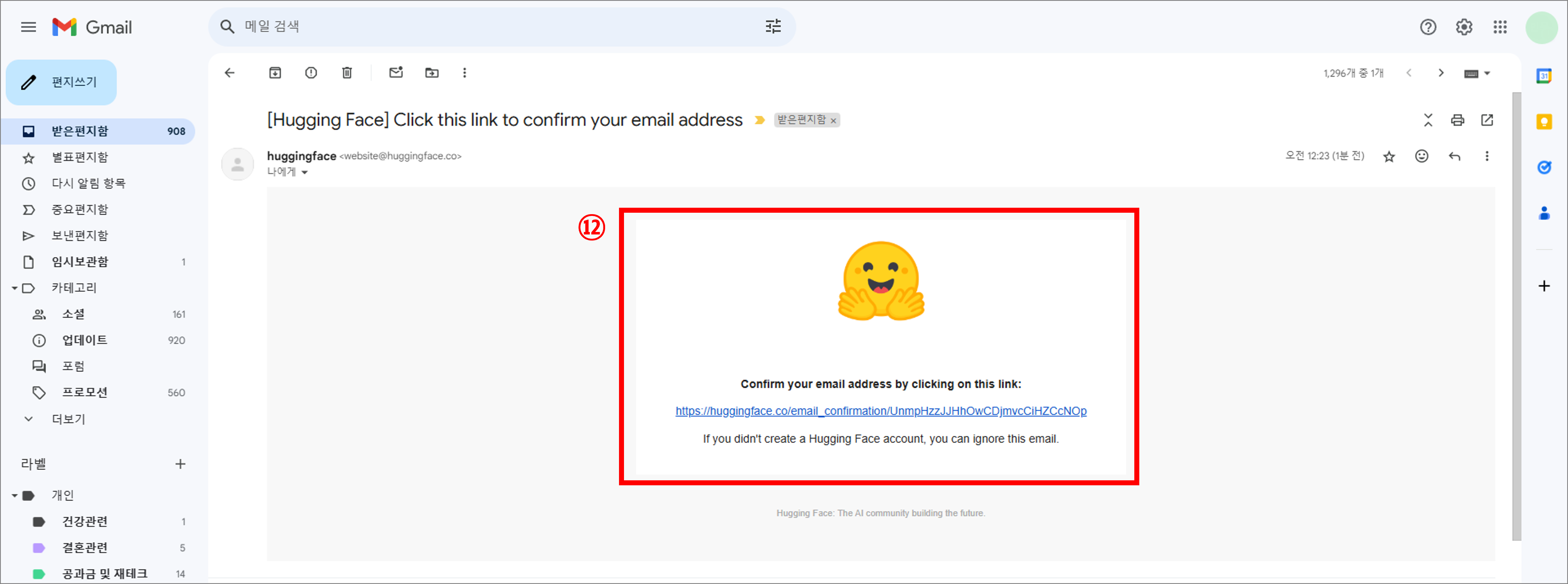 | ⑫ 이메일 인증 링크 클릭 | 저는 회원가입할 때 지메일을 입력했어요. 여러분도 가입할 때 입력한 이메일을 확인해보세요. 그럼 위의 이미지와 같이 허깅페이스에서 인증 메일을 보냈을거에요. 가운데에 있는 링크를 클릭하면 회원 가입 인증이 완료되요. 링크를 클릭해주세요! |