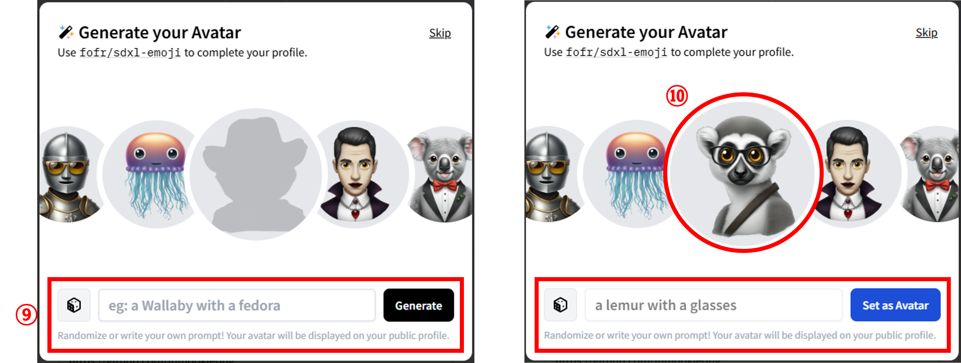 | ⑨ 아바타 특징 입력 | 아바타를 생성하기 위한 특징을 프롬프트에 입력해주세요. 저는 기본으로 제공하는 프롬프트를 사용하였는데요. 오른쪽 이미지에 작성된 'a lemur with a glasses'를 프롬프트로 사용했어요. 프롬프트를 입력했으면 'Generate' 버튼을 클릭해주세요. |