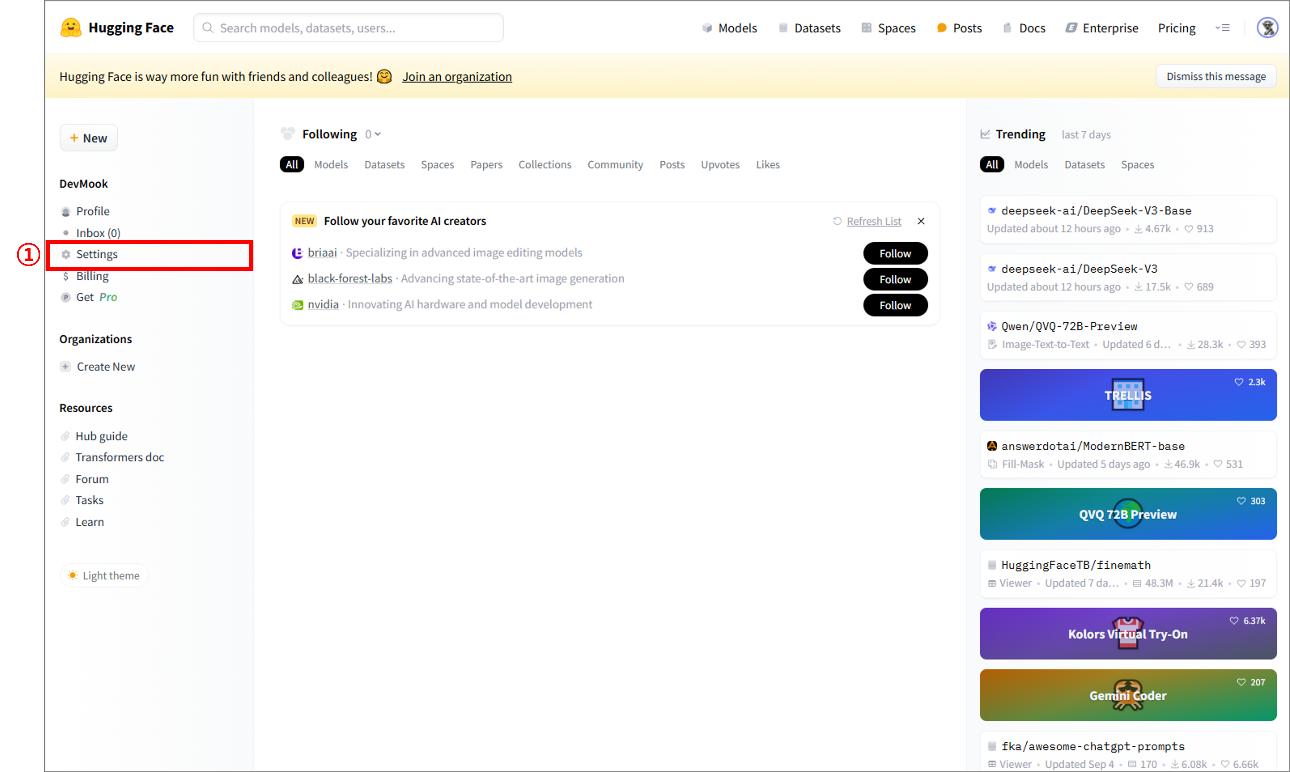 | ① Settings 메뉴 선택하기 | 허깅페이스에 로그인을 하면 위의 이미지와 같은 화면을 볼 수 있어요. 토큰(Token)을 생성하기 위해 왼쪽에 있는 'Settings' 메뉴를 클릭 해주세요. |