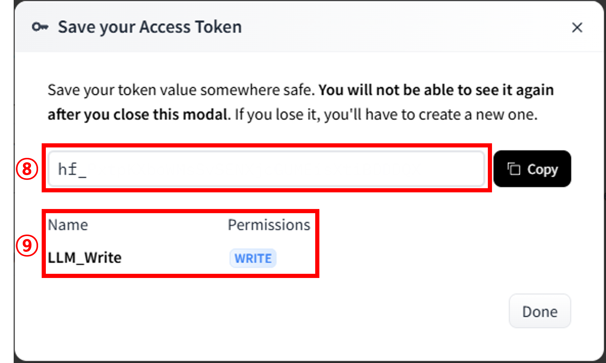 | ⑧ 생성된 토큰 값 확인하기 | 'hf_'로 시작하는 토큰의 값이 보이시나요? 허깅페이스의 토큰이 생성되었어요. 이 값을 어딘가에 잘 저장해주세요. 토큰 값을 잃어버리면 찾을 수 없어서 다시 생성해야 되더라고요. |