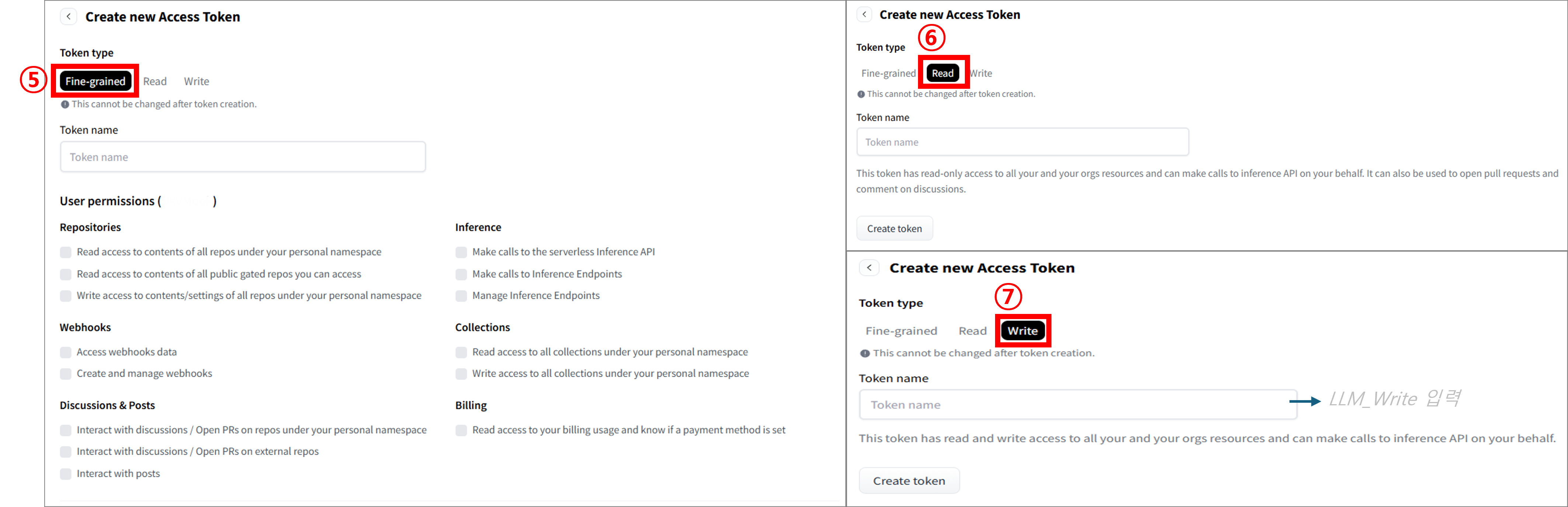 | ⑦ Write | 읽기와 쓰기 권한을 갖는 토큰이에요. 모델이나 데이터셋을 업로드하거나 수정할 때 사용해요. |
