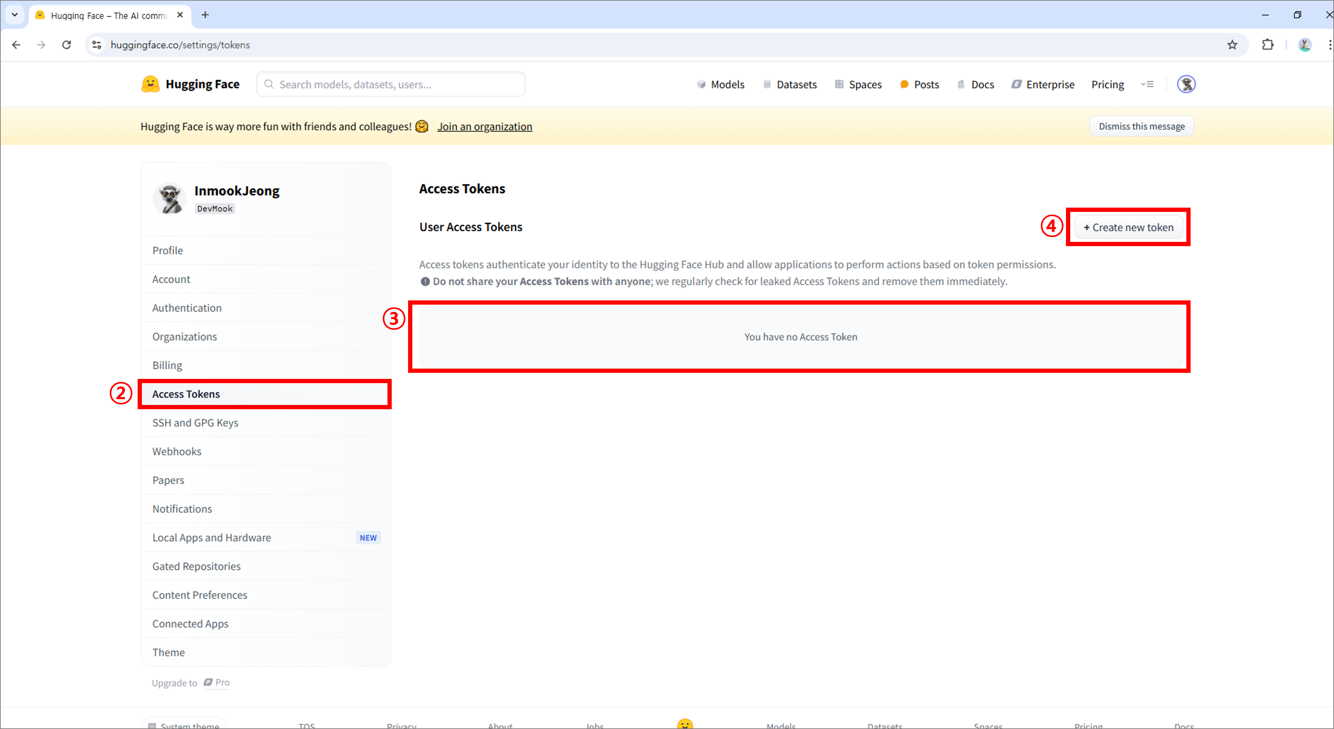 이제 허깅페이스를 활용하기 위한 토큰(Token)을 발급해볼게요.