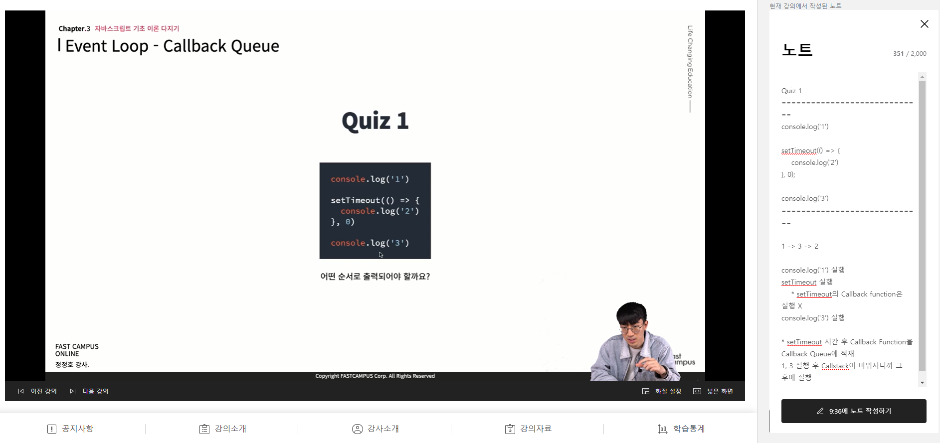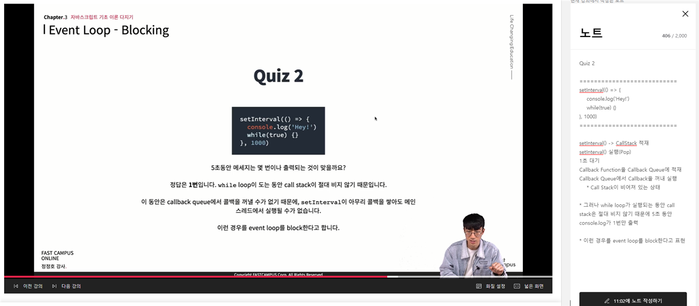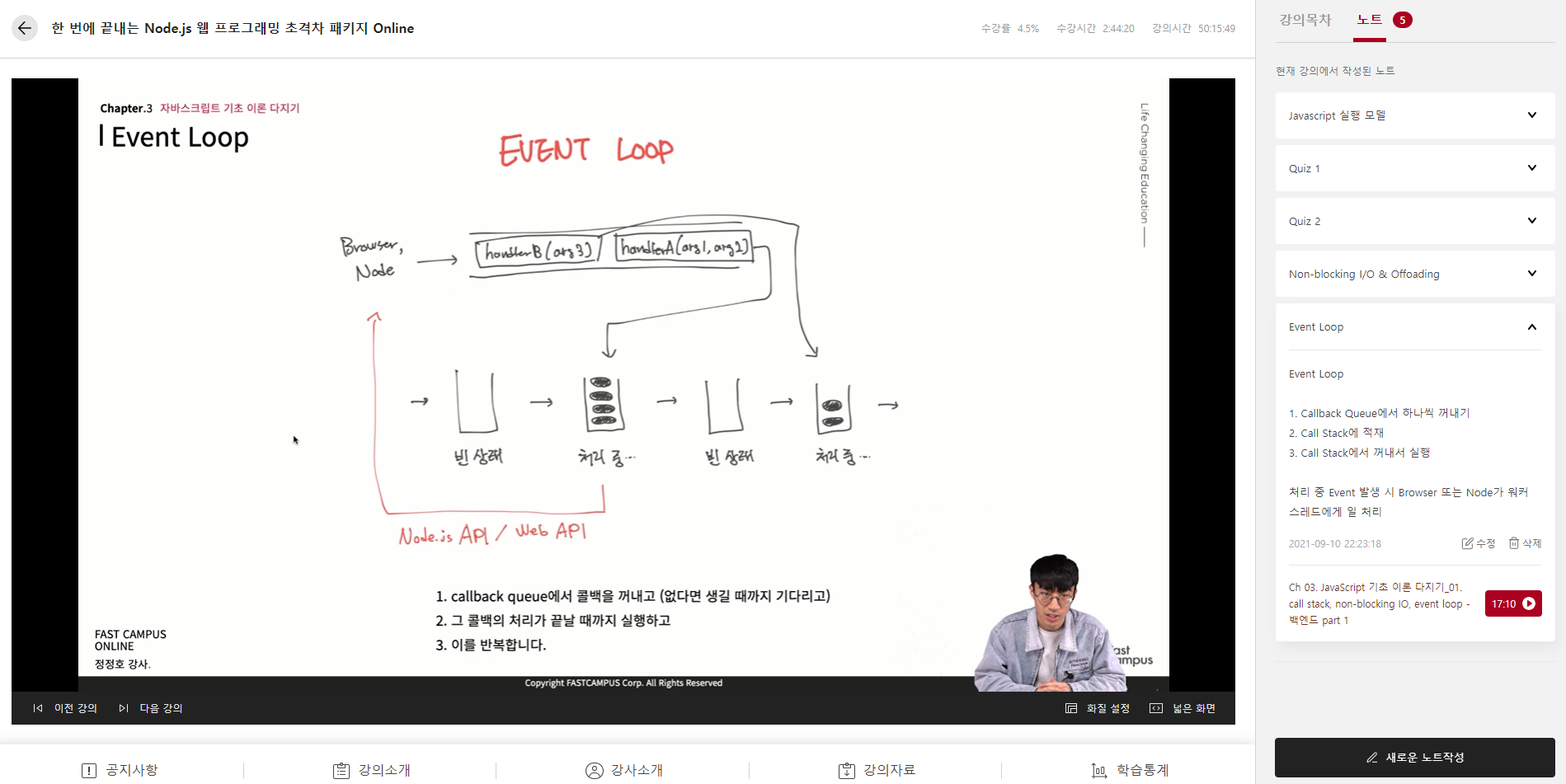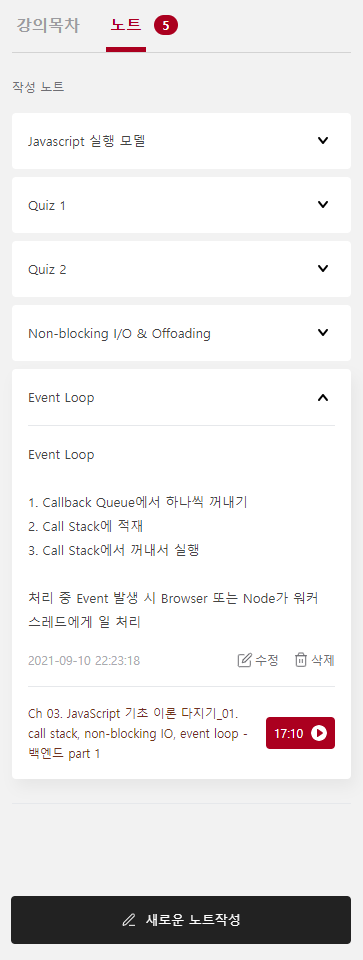 참고로 오늘은 평소에 자주 사용하던 VS Code가 아닌 패스트캠퍼스 강의 우측에 있는 노트를 활용하여 강의 내용을 정리해 보았다. 수강 중에 중요한 정보 등을 작성하기 위해 '새로운 노트작성' 버튼을 클릭하여 노트를 작성할 수 있고, 노트가 강의 어느 시점에 작성되었는지 알 수 있어 수강하는데 도움이 많이 될 것 같다. 앞으로 이론 강의는 '노트'를 통해 정리해야겠다. |