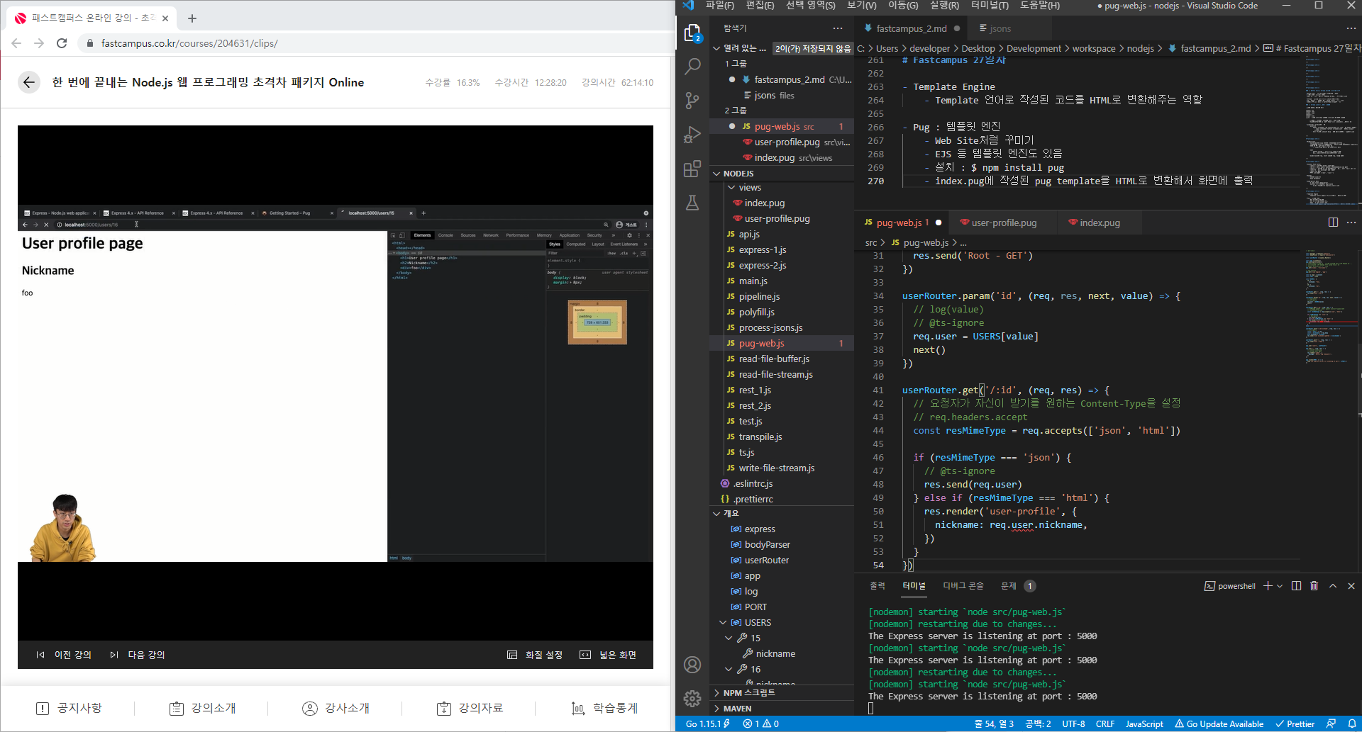 하지만 이번 강의에서는 Pug라는 Template Engine을 활용해서 화면을 구현하였다.