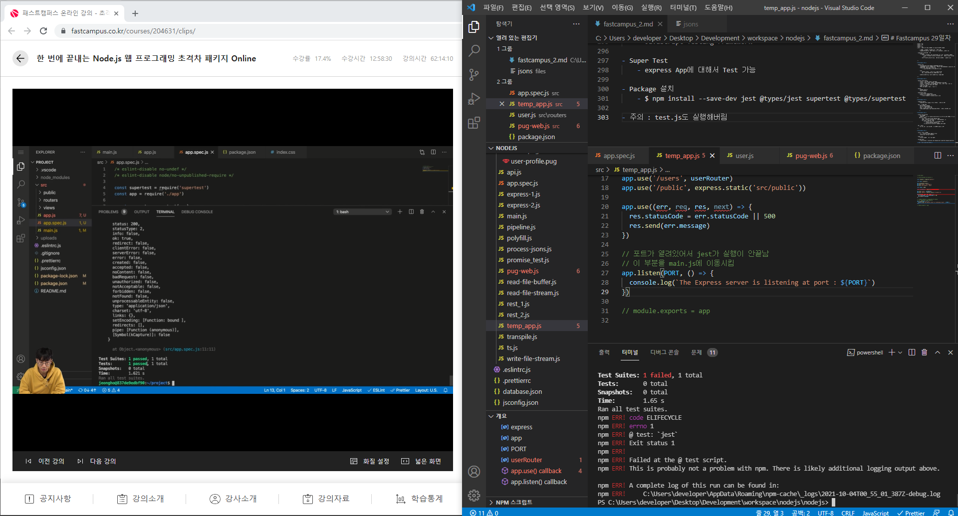 그러므로 NodeJS 뿐만 아니라 Javascript 등을 개발할 때 이번 강의에서 사용한 jest, supertest와