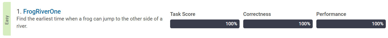 The goal is to find the earliest time when the frog can jump to the other side of the river. The frog can cross only when leaves appear at every position across the river from 1 to X (that is, we want to find the earliest moment when all the positions from 1 to X are covered by leaves). You may assume that the speed of the current in the river is negligibly small, i.e. the leaves do not change their positions once they fall in the river.